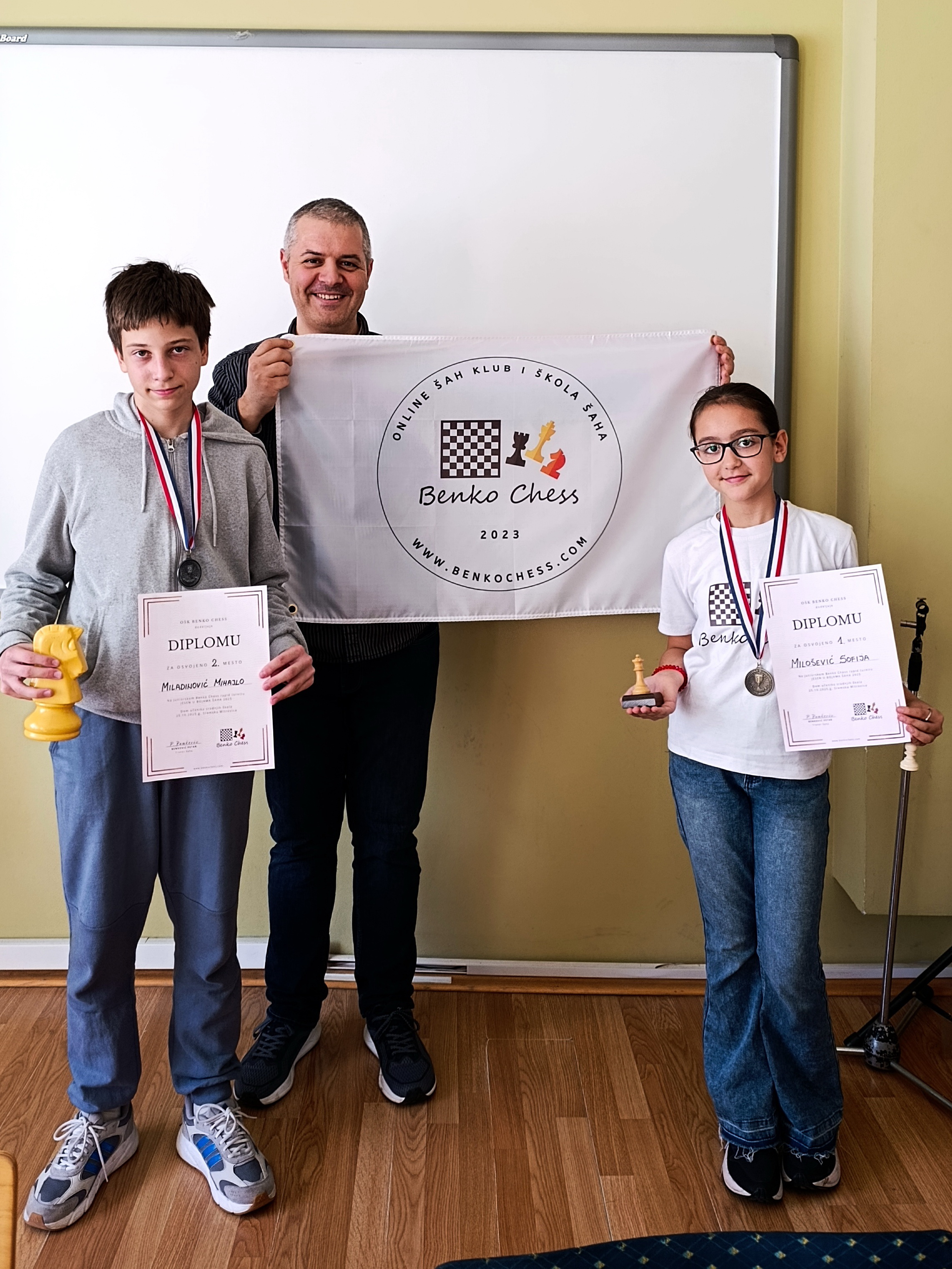 Medaljama su nagrađeni najbolje plasirani učesnici u muškoj konkurenciji Nestorović Filip, Dobrić Luka i Grozdanić Milan, a u ženskoj grupi Jelenković Neda, Simić Anja i Marković Višnja. Svi učesnici su bili nagrađeni diplomama. Zoran Đurić Katanović je obezbedio dve enciklopedije šahovskog otvaranja koje je podelio najuspešnijima u muškoj i ženskoj konkurenciji, i jedan lep drveni šah koji je dobila četvrta dama na turniru Lana Miličević kojoj je pripalo poslednje mesto. Želja nam je da se ubuduće više devojčica priključi našem online šah klubu. Zahvaljujemo se Domu učenika srednjih škola za obostranu saradnju u popularizaciji šaha u našem gradu.