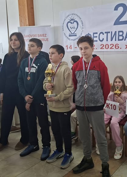 Naši mladi šahisti ostvarili su odlične rezultate na kadetskim festivalima mladih. Miladinović Mihajlo 🥈 osvojio je 2. mesto sa 7 poena iz 9 partija na 28. Festivalu mladih ŠSCS u Ravnom Gaju (U14). Čobanović Nenad 🥈 takođe je osvojio 2. mesto sa 7,5 poena iz 9 partija na 33. Vojvođanskom festivalu mladih na Paliću (U10). Solidne nastupe ostvarili su i Milošević Sofija - 7. mesto sa 3 poena iz 6 partija na Kadetskom prvenstvu Beograda (U12) i Domazet Filip – 13. mesto sa 3 poena iz 7 partija na Kadetskom prvenstvu Beograda (U12). Čestitamo svim našim mladim šahistima na lepim rezultatima! Ovo je tek zagrevanje za Prvenstvo Srbije. ♟️💪 ŠSCS U14 , Vojvodina U10 , BG U12 , BG U12ž , Mihajlo , Nenad