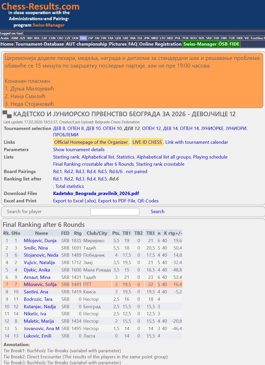 Chess-Results: ŠSCS U14 , Vojvodina U10 , Beograd U12ž , Beograd U12